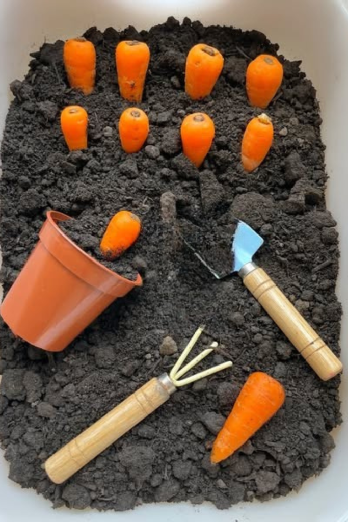 Small garden tools help with gripping, pulling, and twisting movements. Play carrots give children a clear goal while digging.