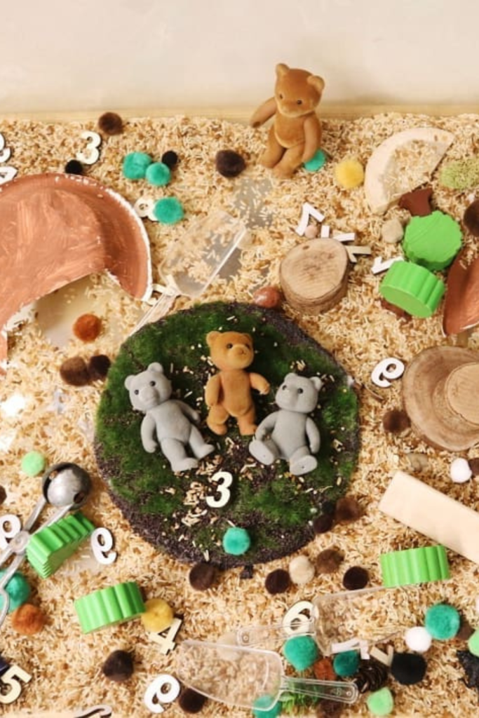 Shredded paper or sawdust creates a soft forest floor. Bears, loose parts, and number pieces invite counting through play.