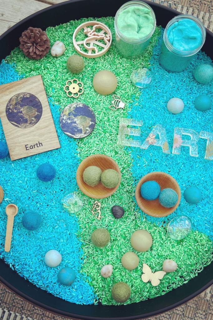 World-themed sensory play encourages calm focus without feeling like a lesson. Blue and green rice represent land and water.