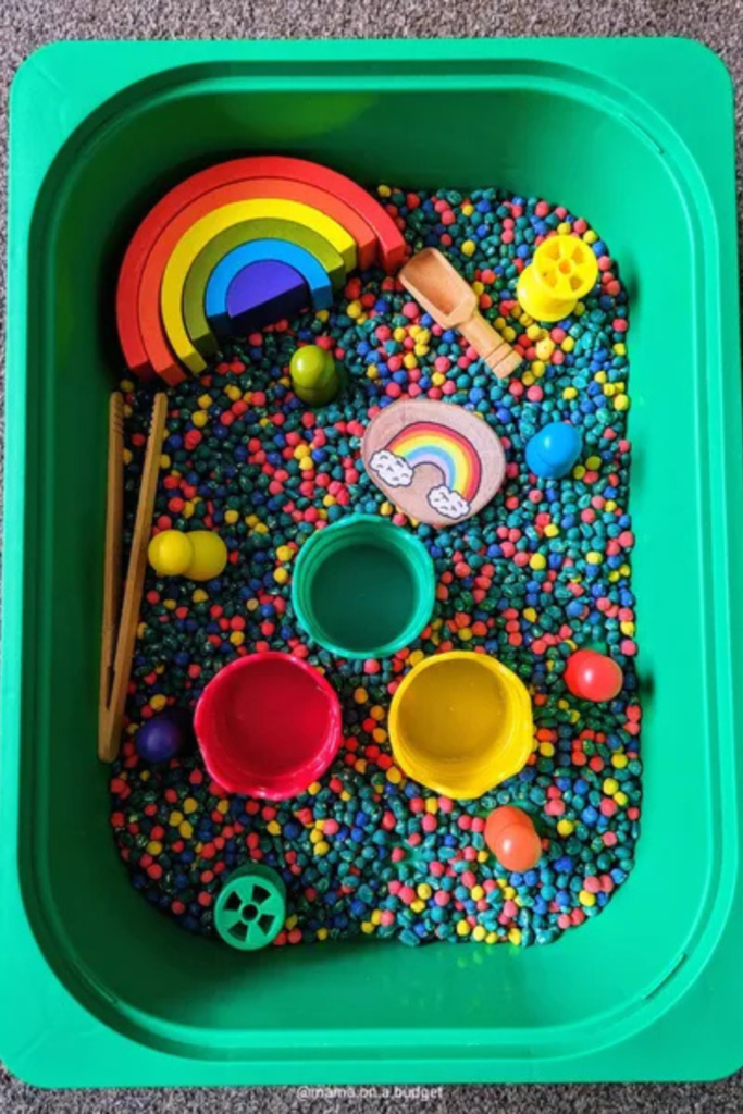 Large, taste-safe fillers work best for toddlers. Rolled oats, cooked pasta, water, and soapy foam are good options.