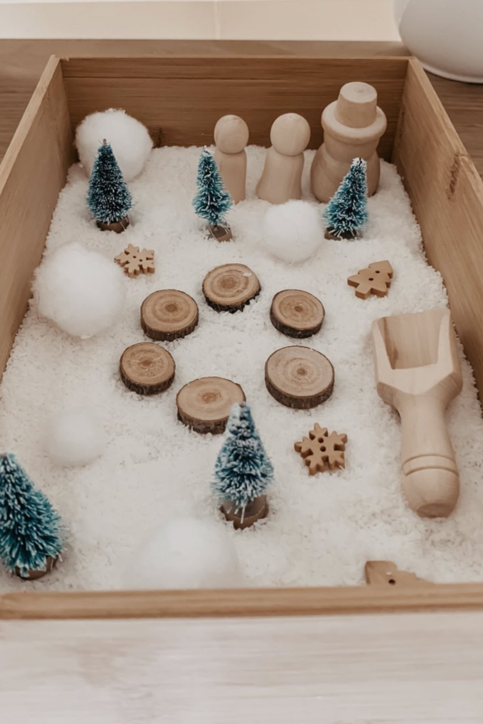 Faux snow or salt creates a quiet base for play. Wooden figures and trees encourage slow arranging and storytelling.