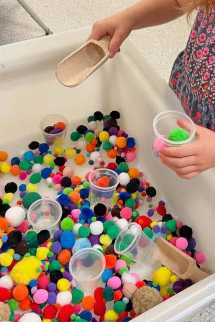 Soft pom-poms make a lightweight base. Scoops and small cups turn transferring into focused work.