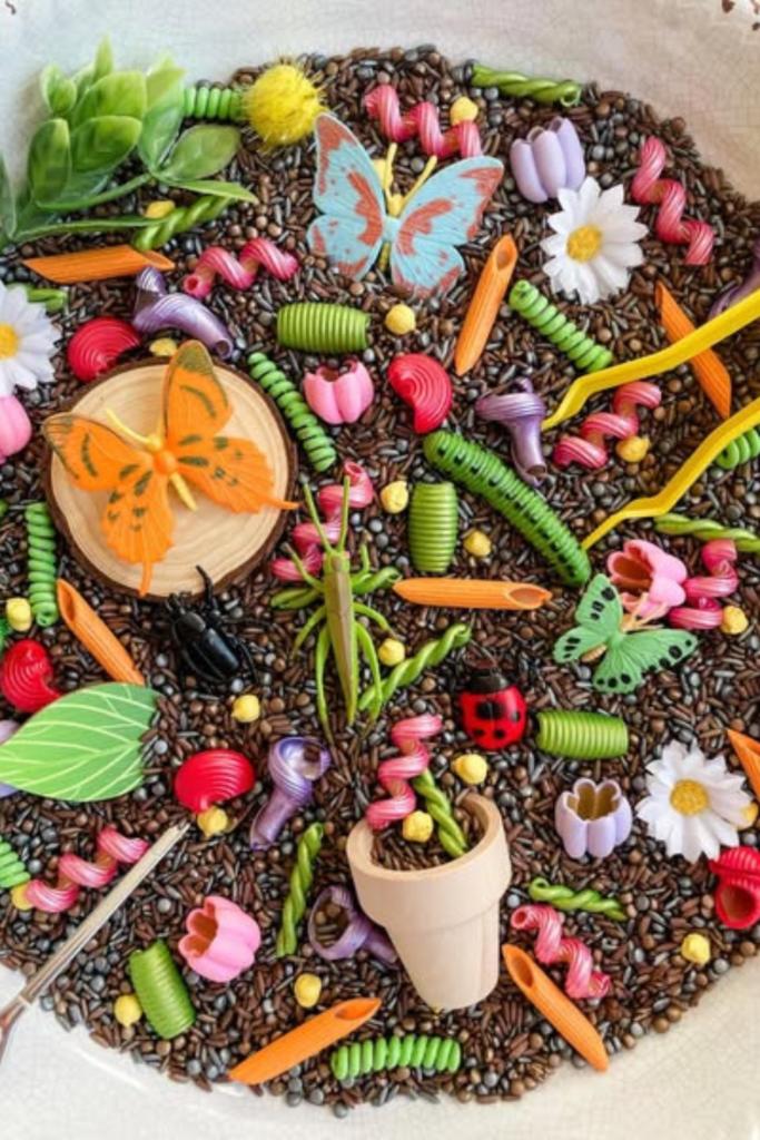 Dark beans or lentils create a rich sensory base. Insects, flowers, and textured pasta invite searching and sorting.