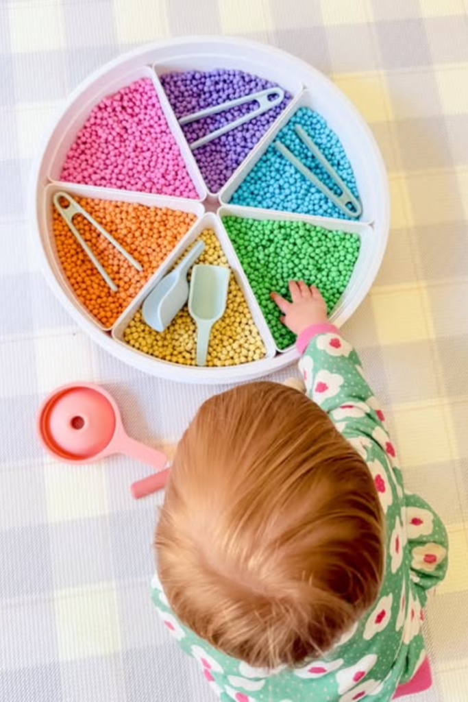 Colorful sensory beads form a playful base. Cups and scoops support pouring and sorting.