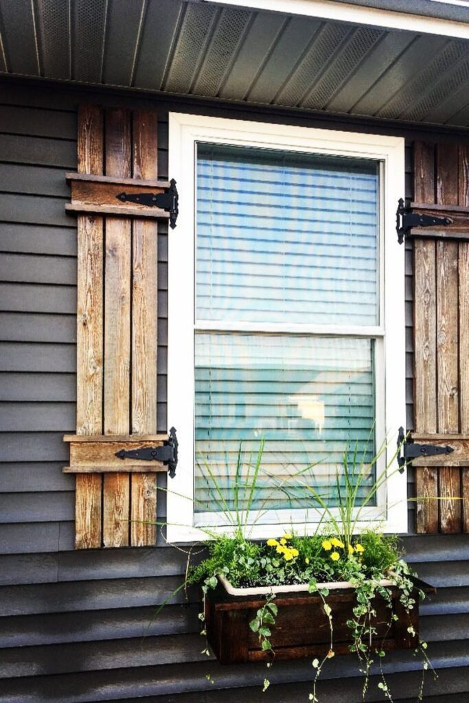 Build a simple wooden box yourself. Fill it with purple and white flowers, green vines, and leafy plants. This natural, handmade style feels cozy and timeless. It looks perfect on a cottage or a house with wood siding.