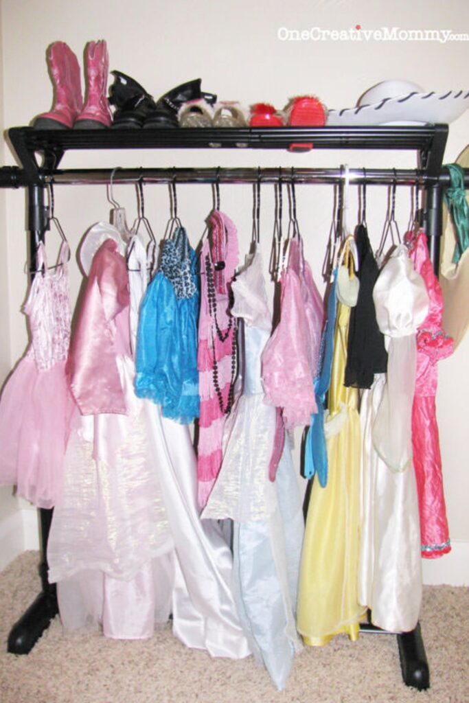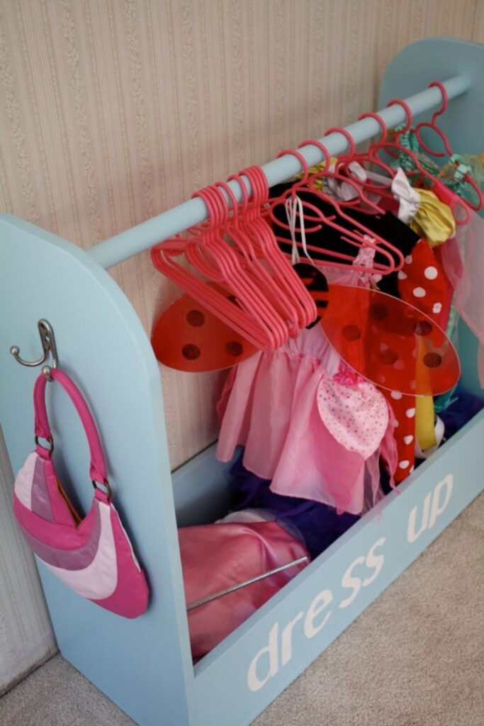 This basic, clean rack fits any dress-up area. The shelves hold baskets and folded items. The hanging bar is perfect for costumes or regular clothes. Recreate it with a white wooden frame. Add soft overhead lighting or a lamp nearby to keep the setup bright.