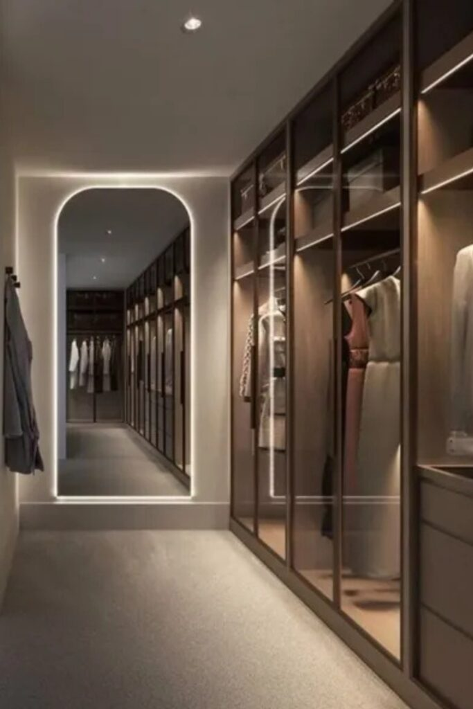 This design takes clothing storage to a new level of style. Glass doors keep everything dust-free and sleek. Soft LED strips highlight each section. If you want style and structure without clutter, use backlit mirrors, warm recessed lighting, and built-in cabinets.