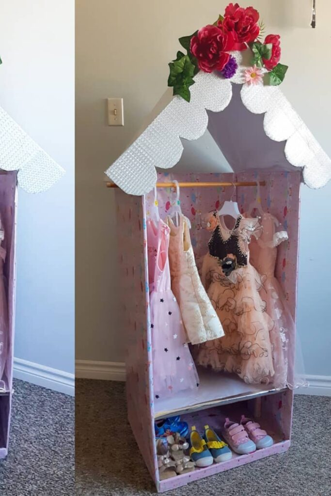 This handmade setup shows you can create a beautiful space without costly furniture. The hanging bar keeps dresses neat. The lower shelf holds shoes and accessories. Make it with a basic cardboard or wooden frame, scalloped trim, fake flowers, and gentle string lights.