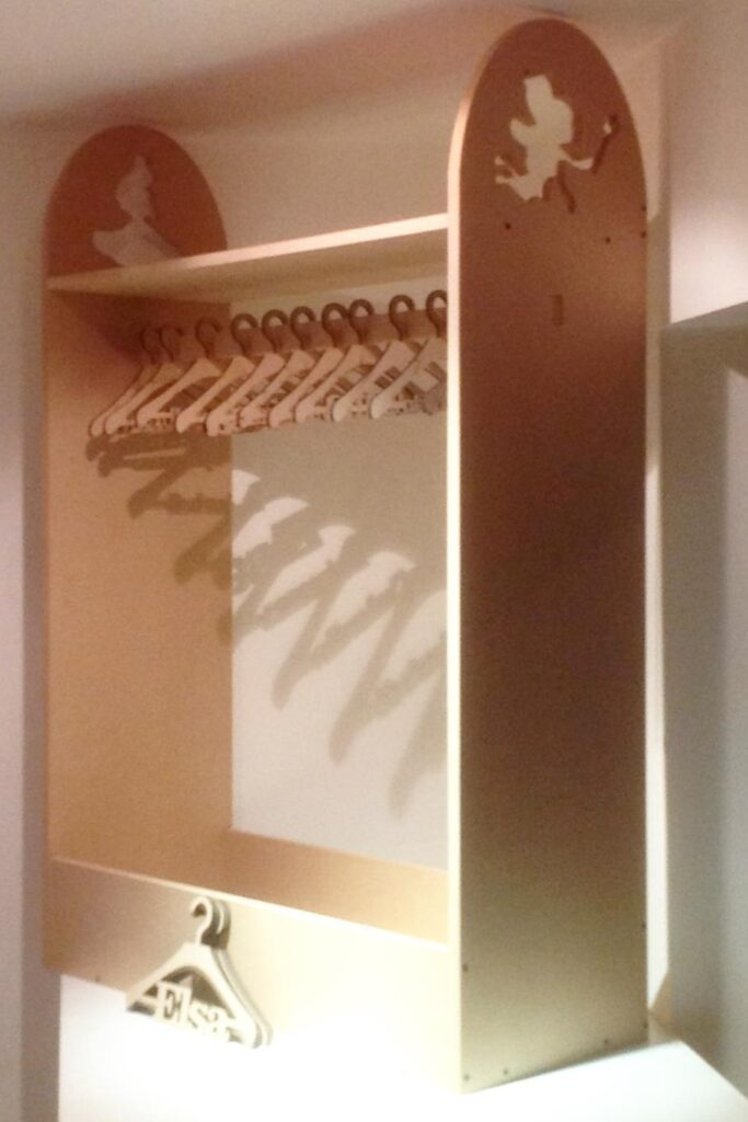 This setup works for both costumes and everyday clothes. The hanging rail keeps garments tidy. The side shelves hold toys, folded clothes, and shoes. Kids can reach everything easily. Copy it with a thin wooden frame. Add warm, gentle lighting from above to keep the space airy and inviting.