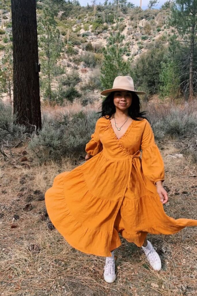 A flowy mustard wrap dress instantly elevates your wardrobe. With puff sleeves, a tiered skirt, and a flattering tie waist, it suits all body types. Style it with white sneakers and a wide-brim hat for a rustic, everyday look.