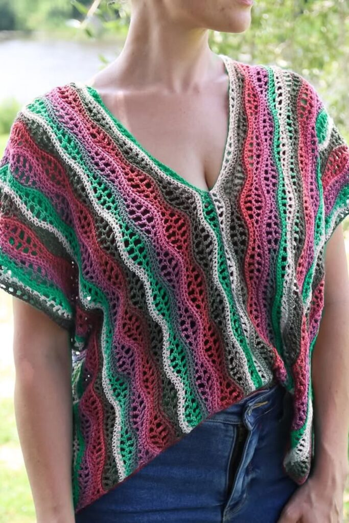 This breezy crochet top features wavy stripes in earthy and jewel tones. It’s perfect for layering over tanks and is an ideal summer festival piece. Great for crochet lovers or thrift flips.