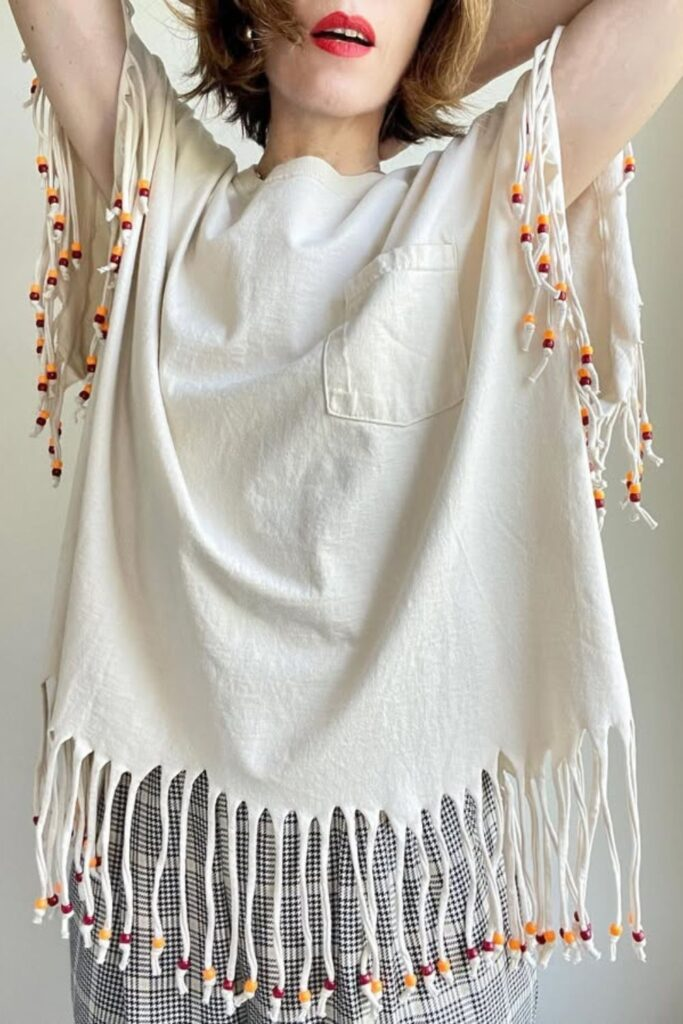 Turn a plain tee into a boho beauty! Add fringed hems and sleeves, then decorate them with colorful beads. A super easy project with a high-impact, artsy vibe.