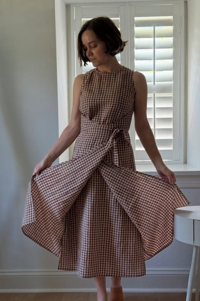 A timeless sleeveless gingham wrap dress—breathable, polished, and perfect for everyday wear. The tie belt and classic pattern create a functional yet stylish silhouette.