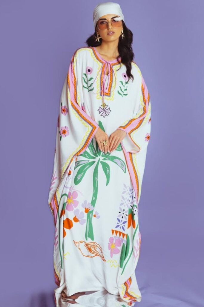 Use hand-painted fabric to create a bold kaftan dress. The relaxed fit, flowy sleeves, and tropical print make it perfect for beach days and resort vibes.