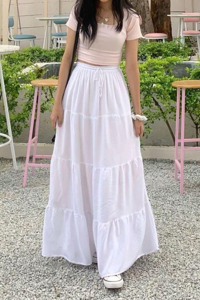 Craft a tiered white maxi skirt using breathable cotton or upcycled bed sheets. Soft, flowy, and easy to style with crop tops or tees.