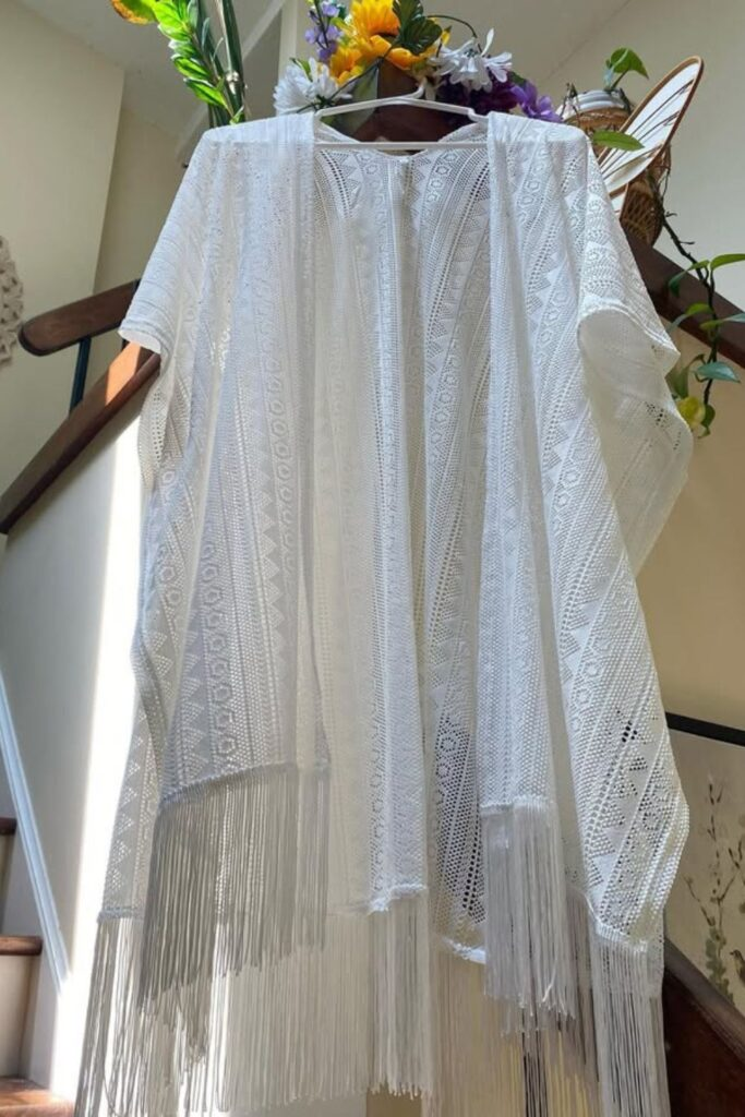 Upcycle lace curtains into a stunning kimono-style cover-up with long fringe. Ideal for festivals, beach outfits, or layering.
