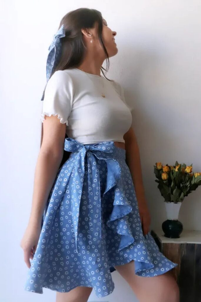 Create a feminine ruffle wrap skirt with a floral pattern and bow closure. Fresh, playful, and great for beginners.