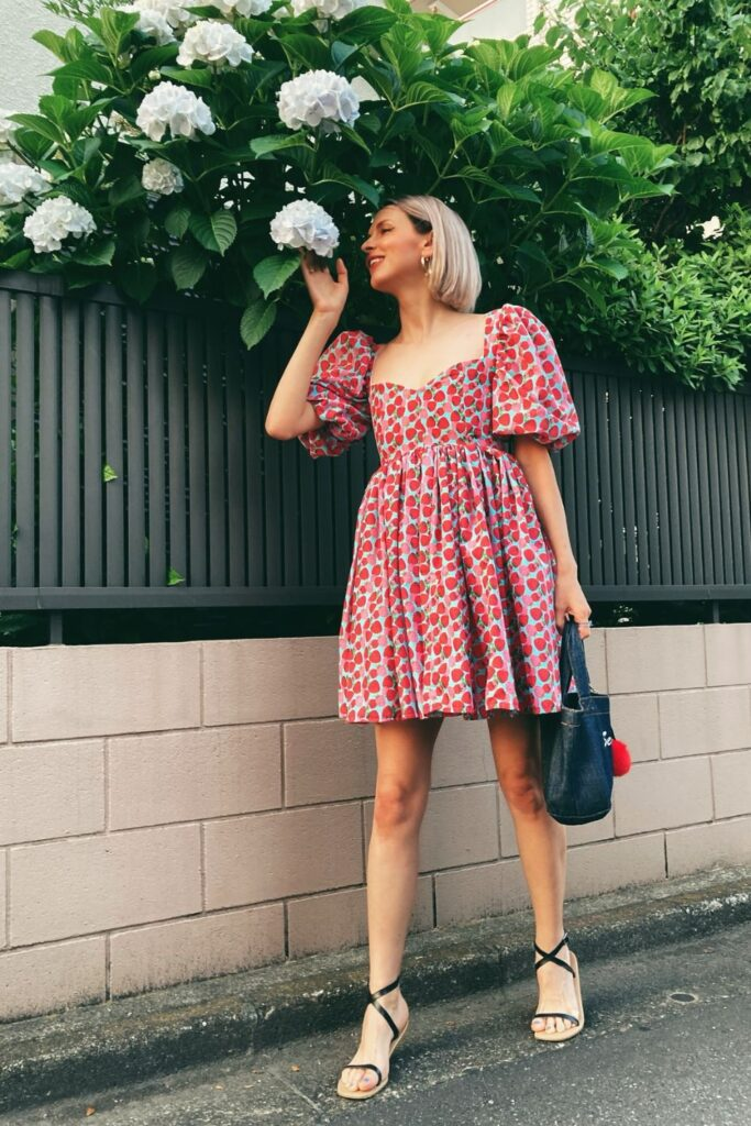 A romantic mini dress with puff sleeves and a structured bodice. Ideal for brunch or city strolls—perfect if you’re ready to try darts and sleeves.