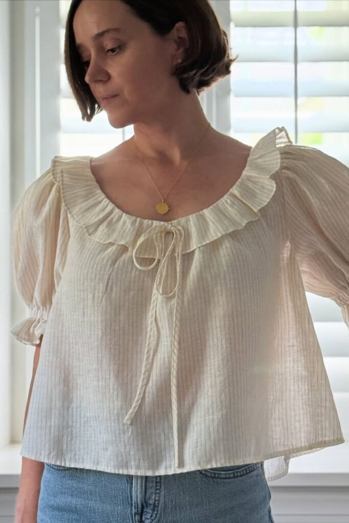 A dreamy cream blouse with puff sleeves, pinstripes, and a lovely tie-front design. Cottagecore-approved and perfect with denim.