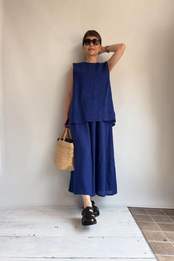 A minimalist two-piece set featuring wide-leg pants and a boxy sleeveless top. Elegant, breathable, and capsule-wardrobe friendly.