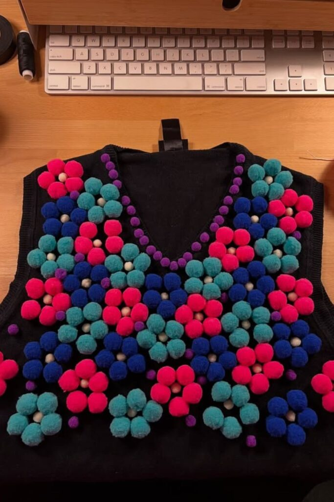Attach 3D pom-poms to a plain black vest for a quirky, colorful statement piece. Fun, bold, and completely customizable.
