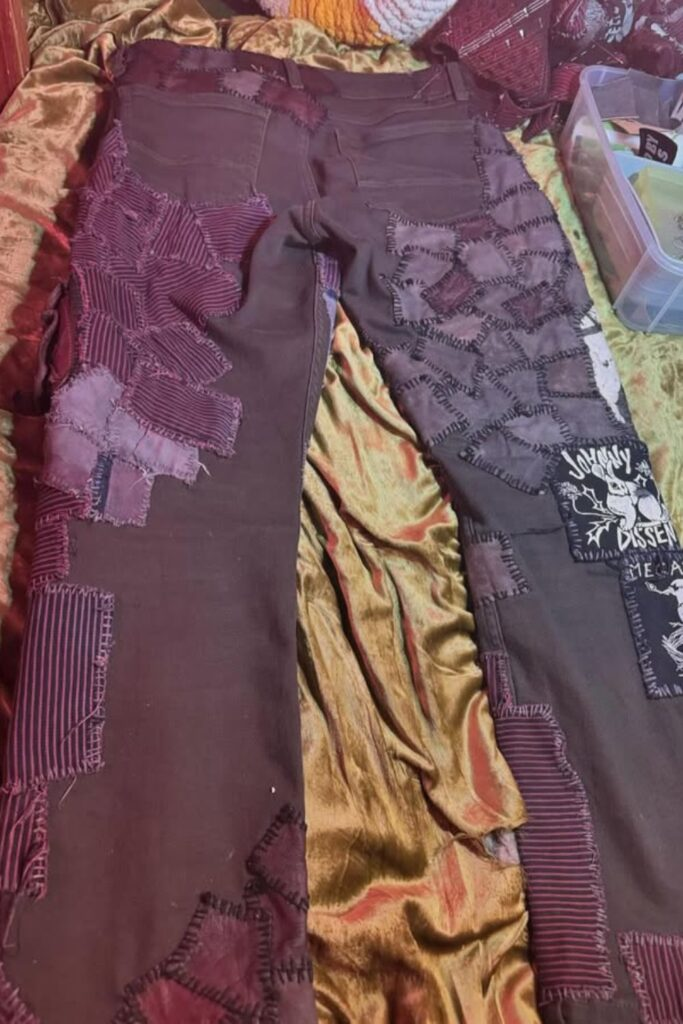 Transform your old jeans into punk-inspired pants with hand-stitched patches, raw edges, and mixed textures. Ideal for fans of visible mending.