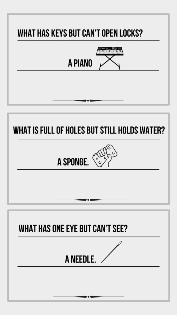 For example, “What has keys but can’t open locks?” The answer is “a piano.” Players can ask for hints if stuck.