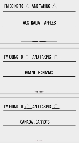 For example, “I’m going to Africa and taking an apple.” Players continue through the alphabet.