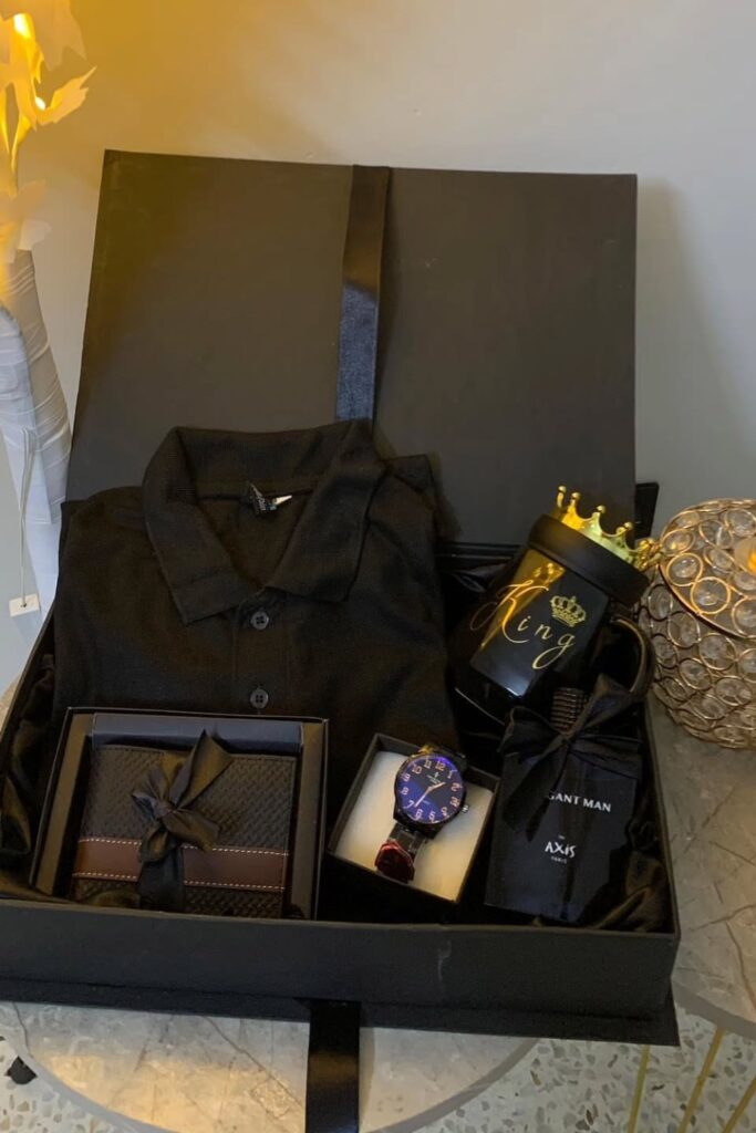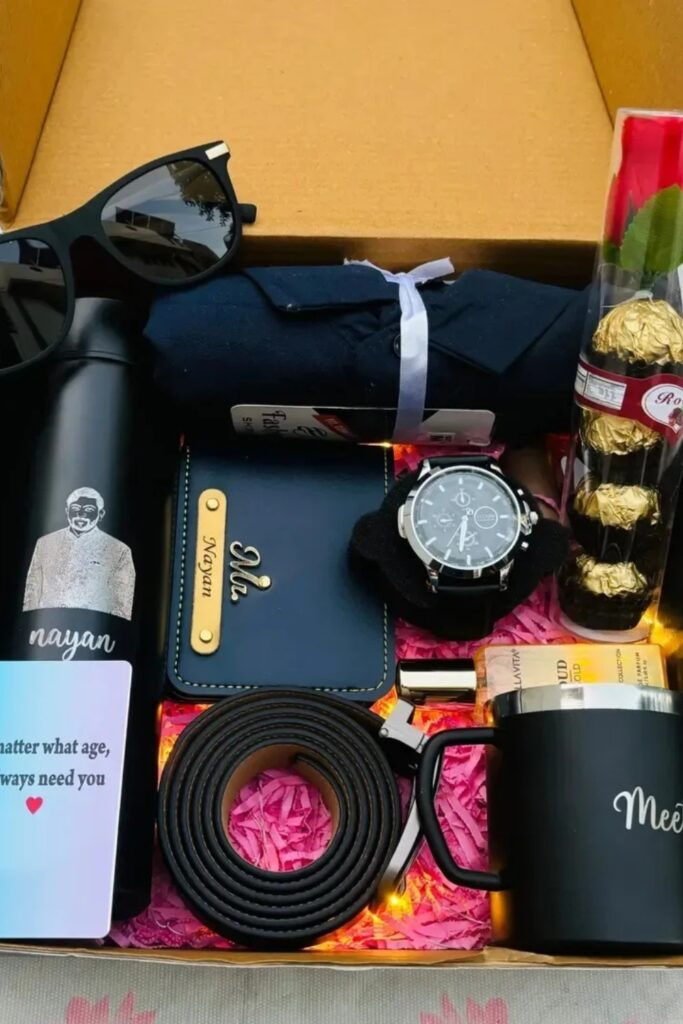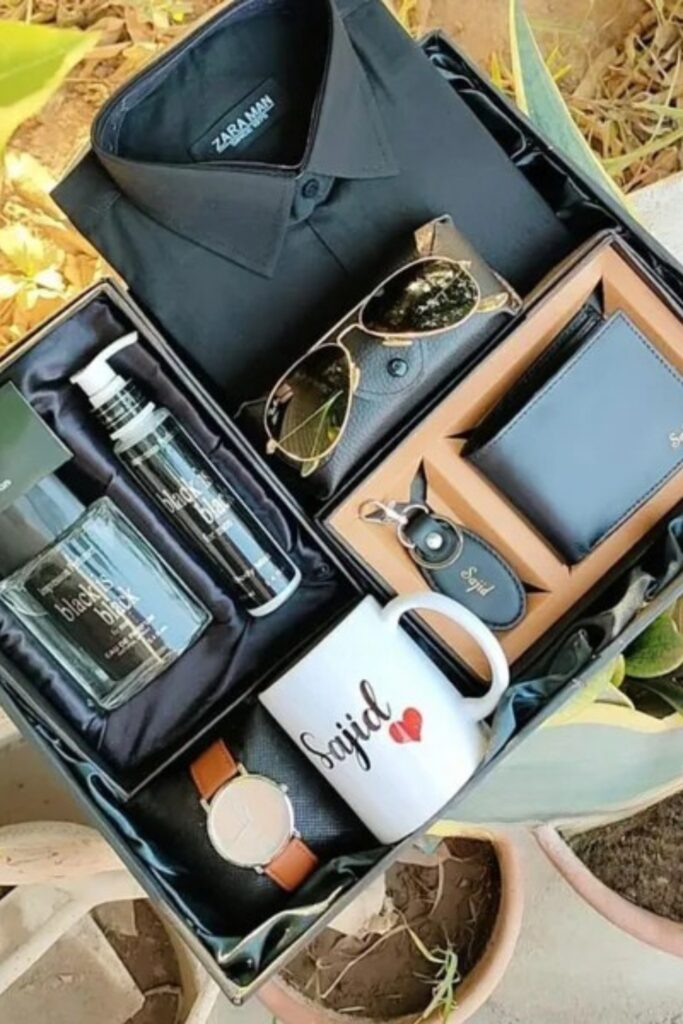 Add a personal handwritten card, a quality watch, his preferred fragrance, and a comfortable sweater. Use tissue or filler paper to create a luxurious unboxing experience.