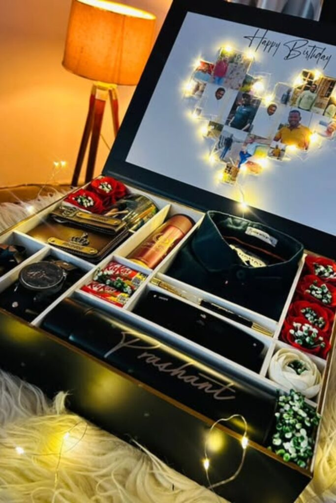 Create a deeply personal gift that combines useful items with sentimental value. Include a shirt, watch, and fragrance alongside photos and handwritten notes.