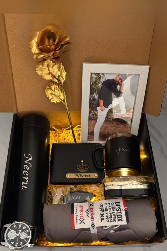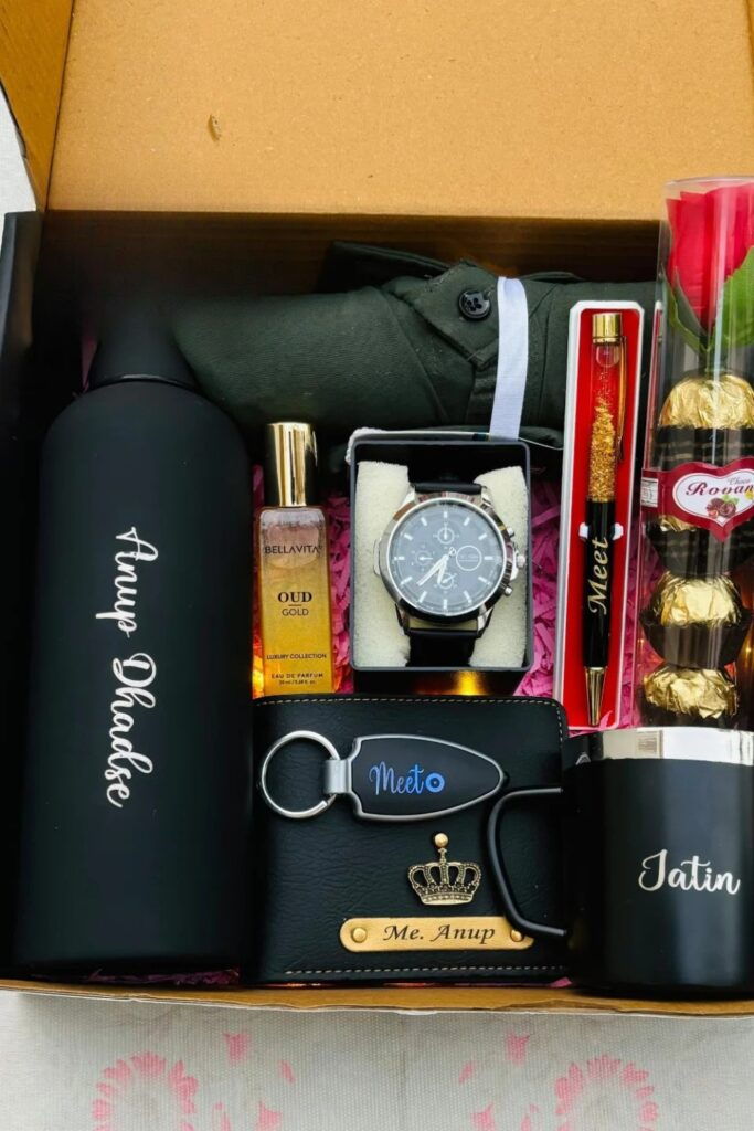 For that timeless, refined look, create a classic black gift box filled with personalized everyday items. Include a wallet, mug, and bottle with engraved names.