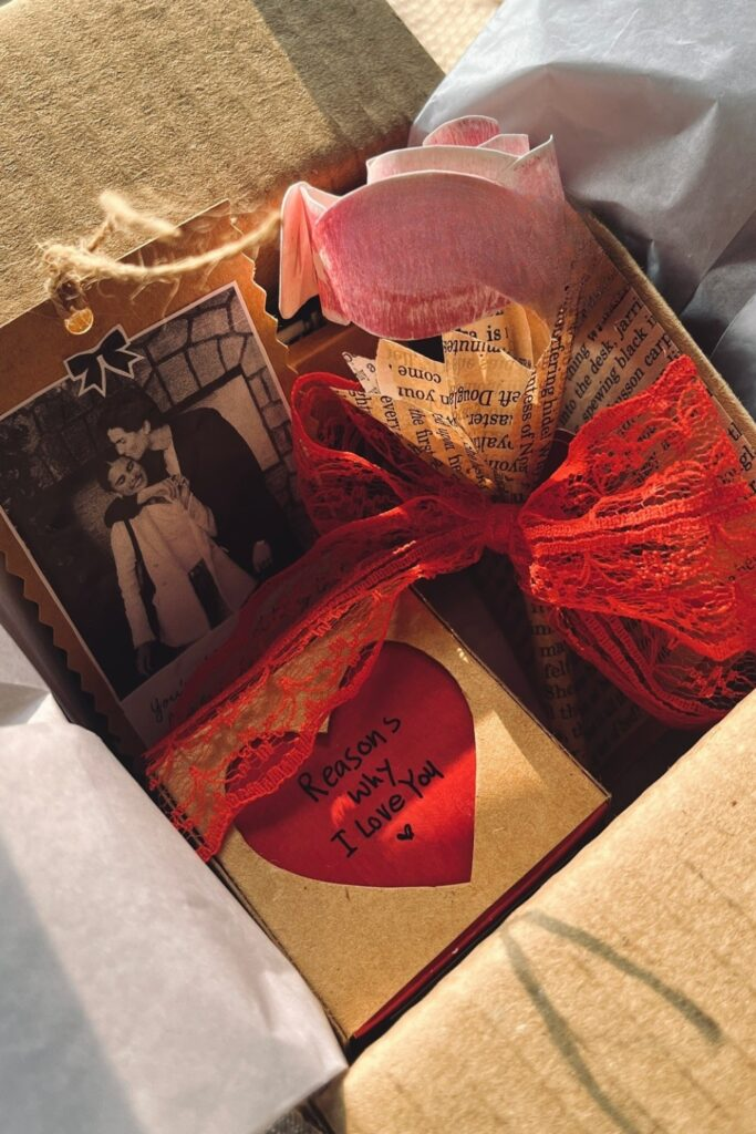 For those deeply personal moments like anniversaries, create a rustic love notes box. Fill a kraft box with handwritten reasons you love him, photos, and small mementos.
