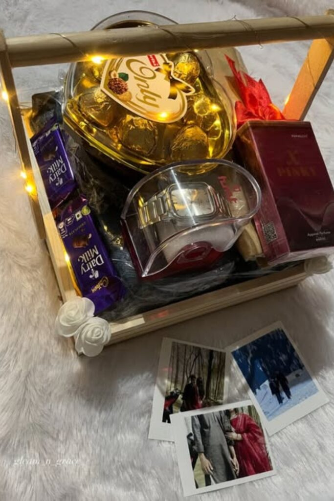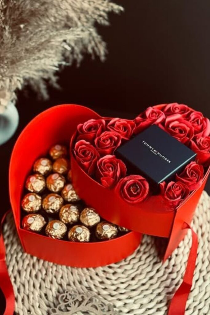 Arrange everything neatly using tissue paper layers in a deep red box for that romantic Valentine’s feel. The combination shows you’ve thought about both style and comfort.