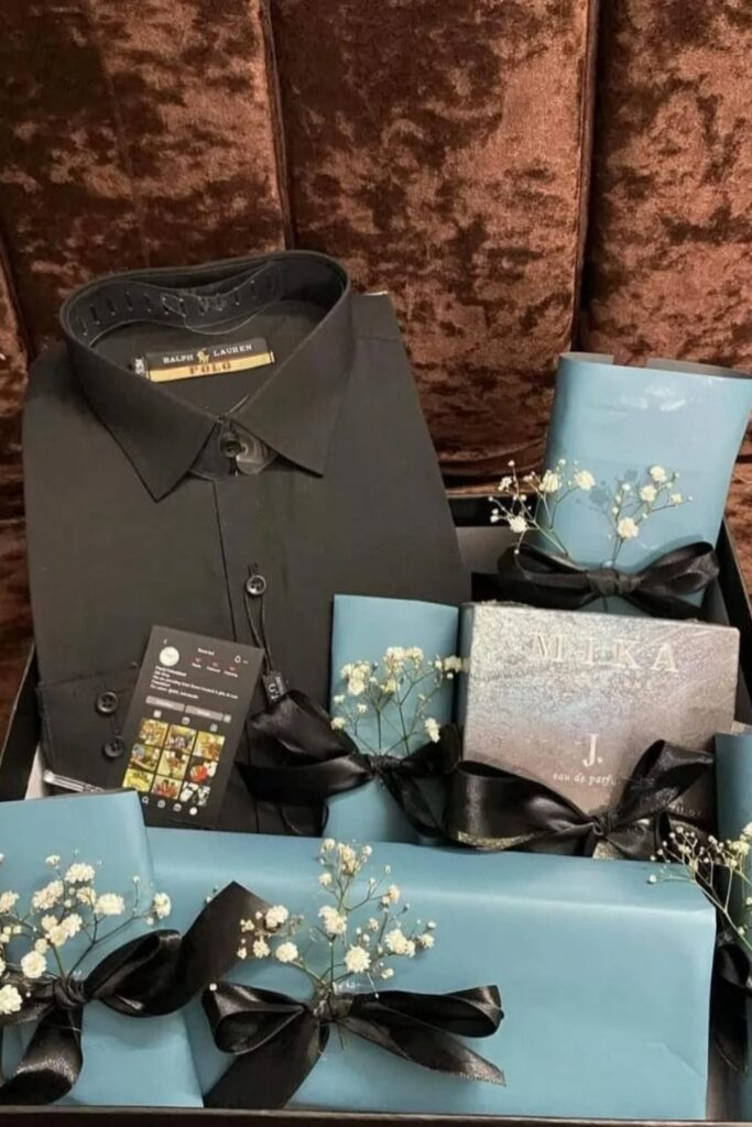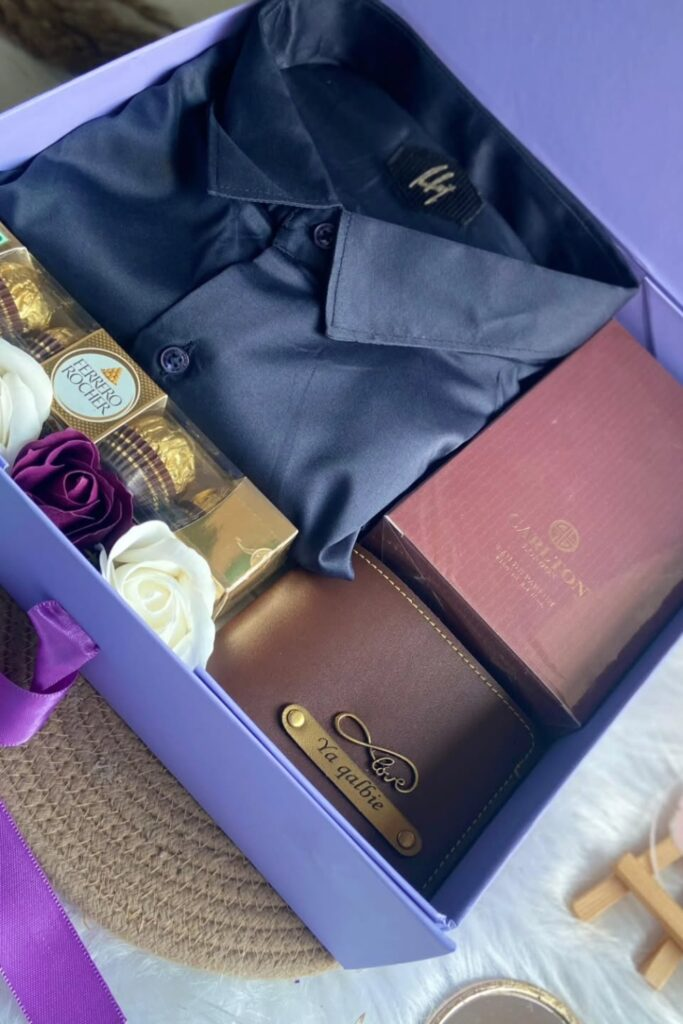 Combine a sleek shirt with chocolates, a leather wallet, and perfume – items he’ll use regularly but feel special receiving.