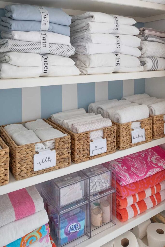 Sort your linens by size and type to make them easy to grab. Soft lighting and clear labels make the closet feel calm and organized.