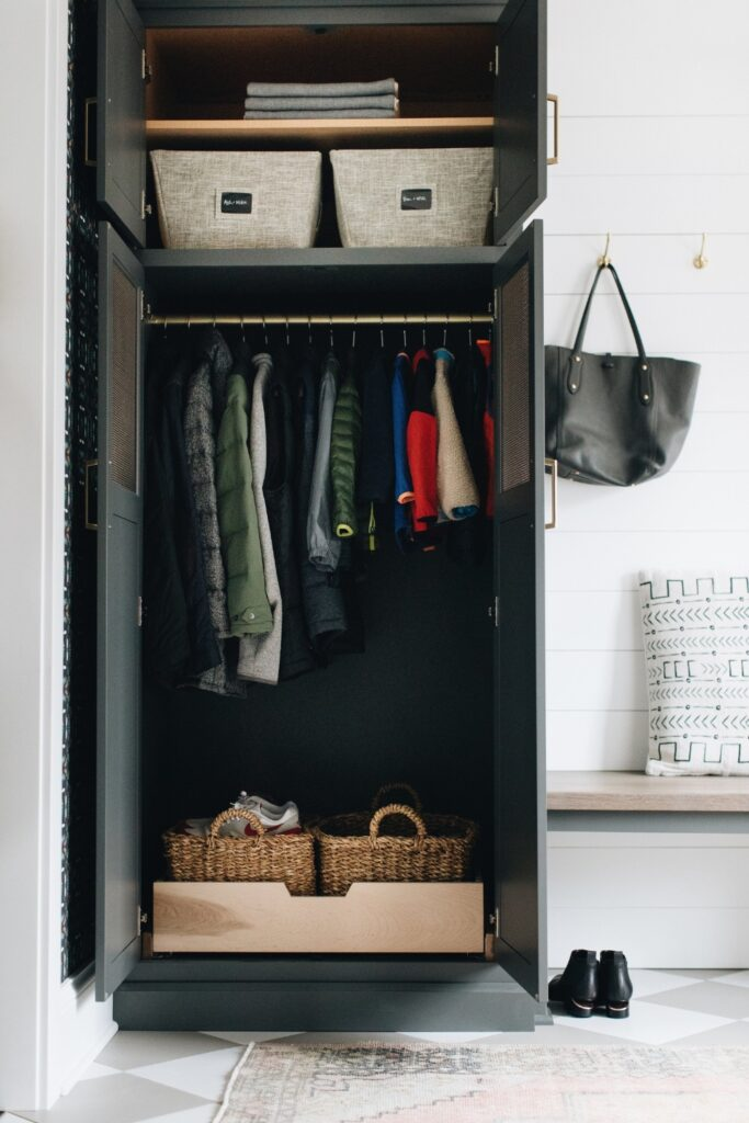 Create a simple closet for your entryway. Hang everyday jackets on one rod. Use baskets on the top and bottom shelves for smaller items.