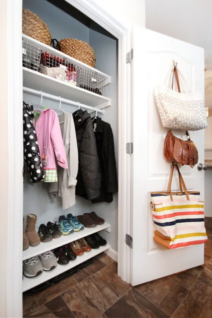 Turn a small closet into a storage powerhouse. Use clear bins with labels, hooks on the door, and hanging racks for shoes.
