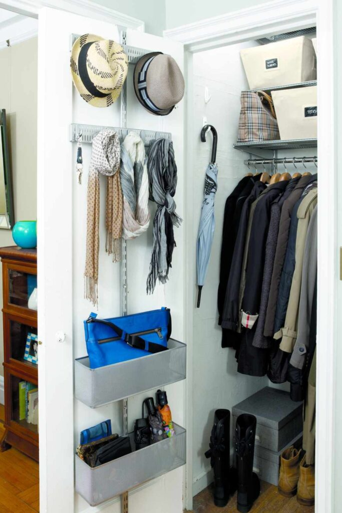 Turn your closet door into a handy station. Use a wall track system with hooks for hats and scarves.