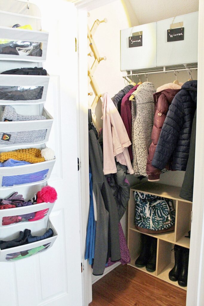 Make a small closet work like a full mudroom. Use the door for baskets that hold hats and gloves.
