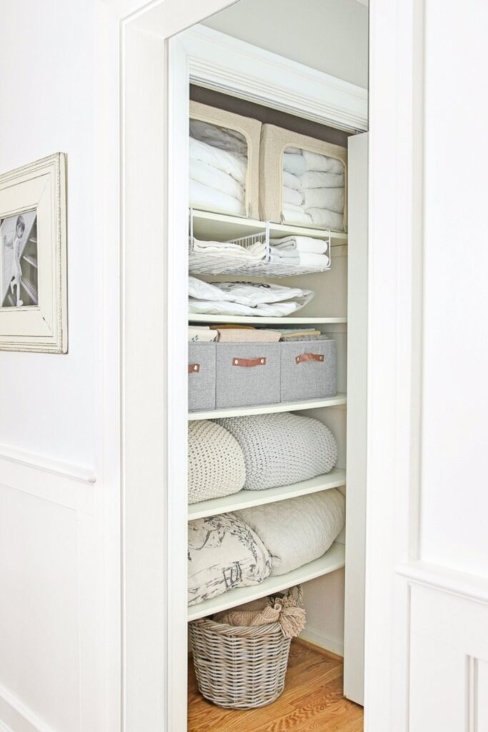 Create a peaceful linen closet with soft colors. Use fabric boxes and neutral bins for a consistent look.
