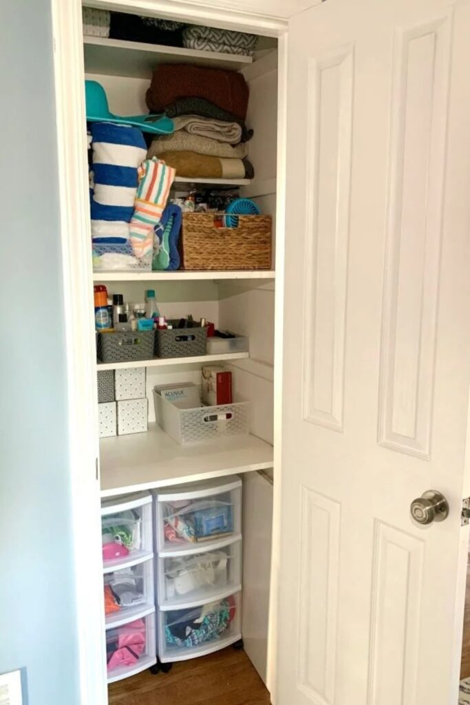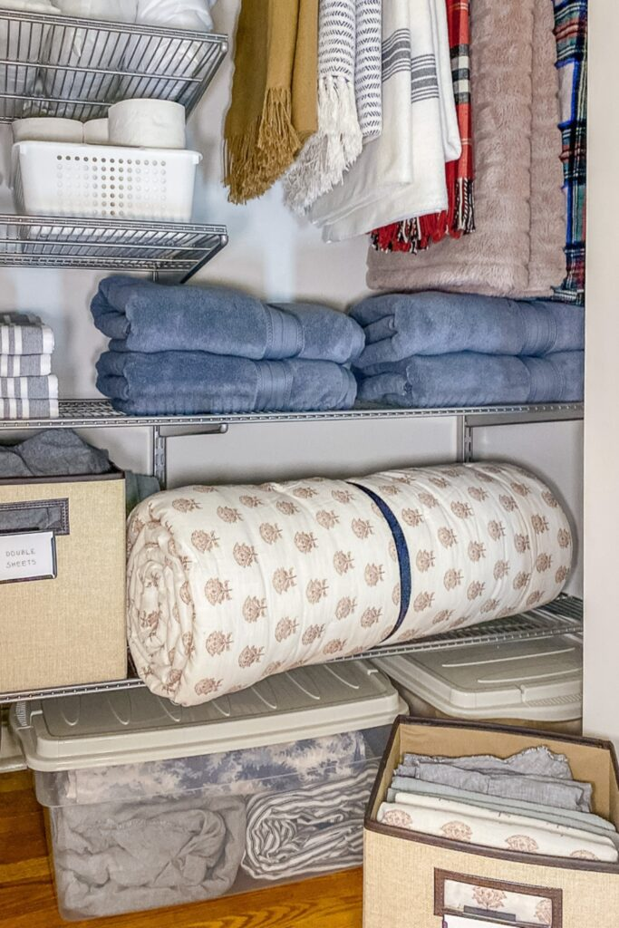 Divide your closet into smart zones. Use the top shelves for blankets and the lower drawers for seasonal items.