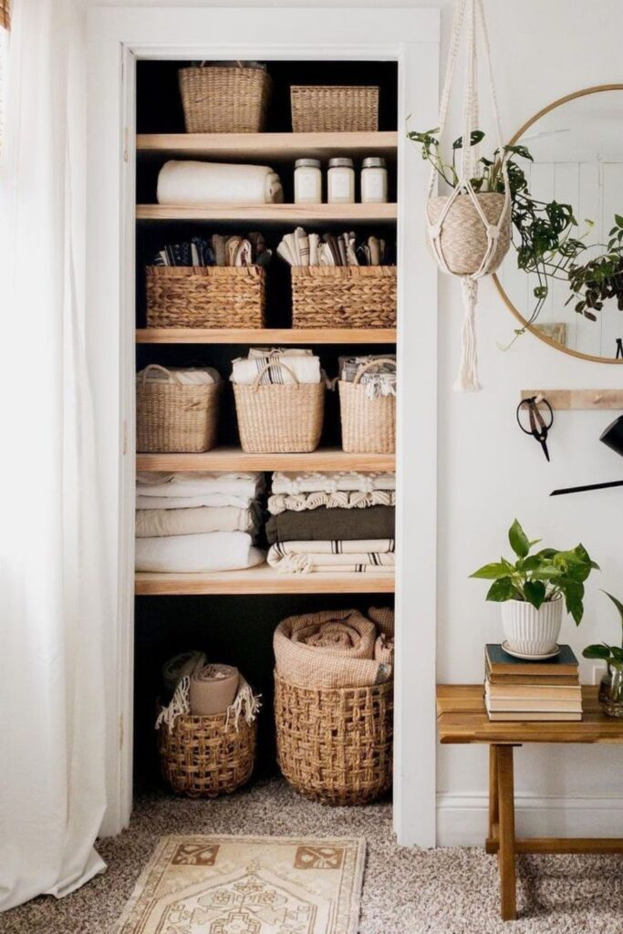 Make your closet feel warm and natural. Use lots of woven baskets and soft textiles.