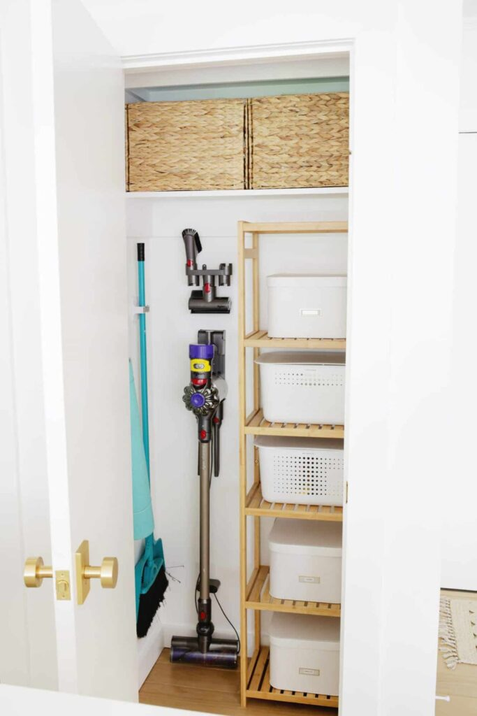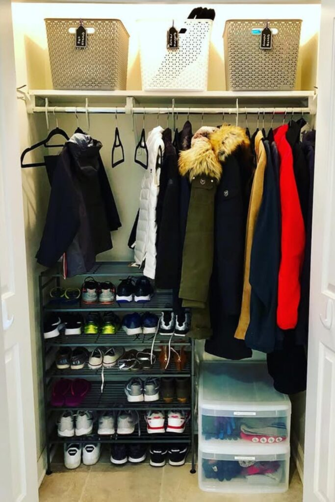 Use shelves and put things in bins with clear labels. You can also hang organizers on the back of the door. Keep things you don’t use often on the top shelf. A small light that turns on when you open the door is very helpful. The goal is to make the closet work for you, not to make it perfect.
