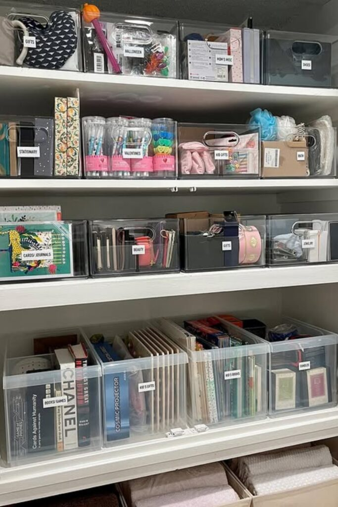 Use clear bins with labels for every category. This turns a messy closet into a neat system.