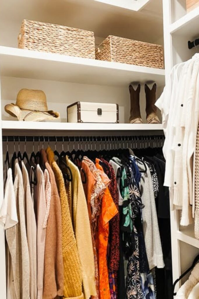 Hang jackets by their color and use matching baskets. A good LED light keeps all the colors looking bright and true.