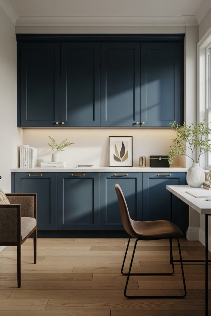 The desk is framed by striking navy blue shelves on the wall.