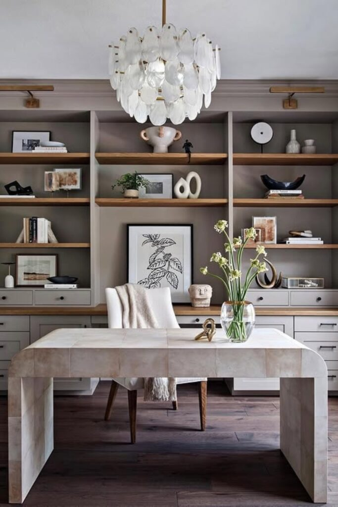 Elegant Workspace with Open Shelving and Statement Lighting