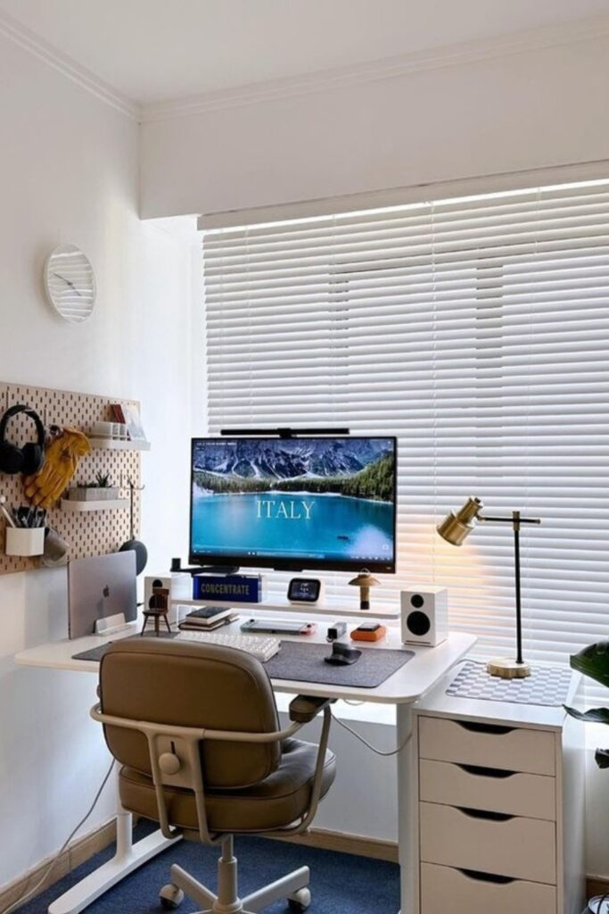 The centered desk makes the space feel purposeful and focused.