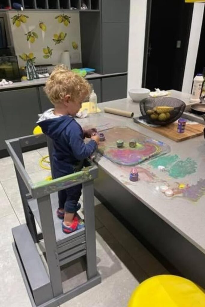 The kitchen counter becomes a creative space with a step stool. Washable mats protect surfaces.
