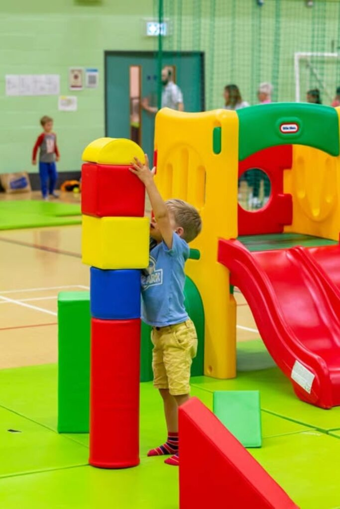 Wooden blocks encourage imagination. Soft floors keep play safe.